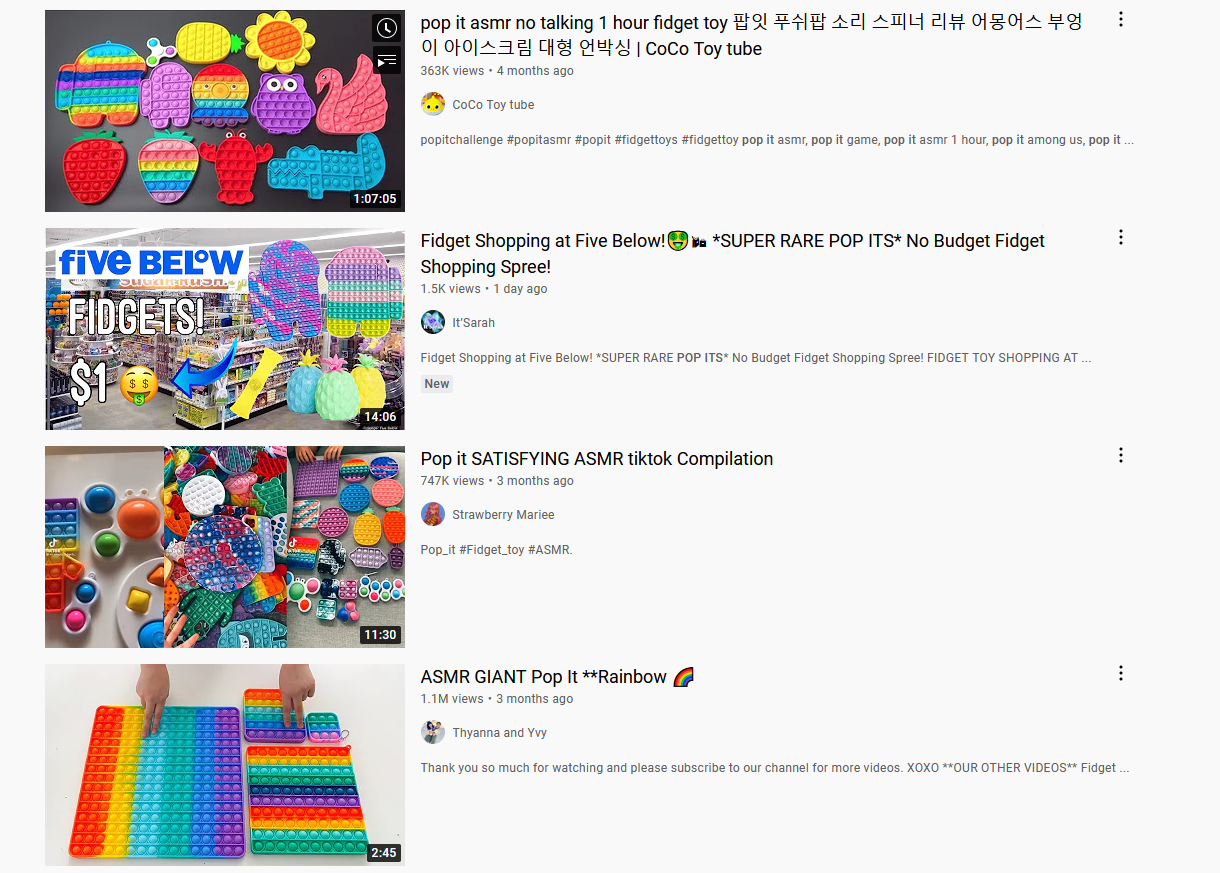 Though fidget poppers have yet to see the same level of crazed searching that the fidget spinner experienced, they’re insanely popular with children right now. Walk into any gas station, grocery store, or major retailers like Target or Walmart, and you’ll find a display of brightly colored silicone pop-its. TikTok and YouTube are filled with videos about the poppers: unboxing, reviews, ASMR pop videos – the list goes on.